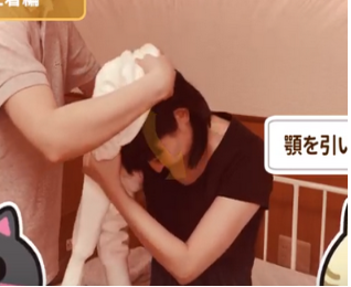 利用者に顎を引いていただき、利用者は服を持った手を下に引くようにします。