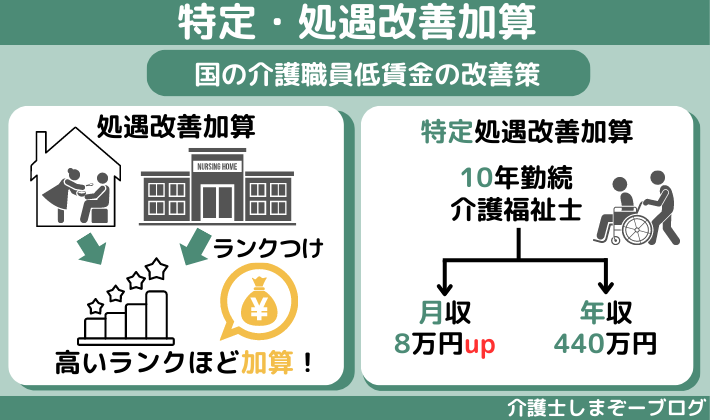 下の過去記事「特定処遇改善加算により介護福祉士はいくらもらえるのか考察しました!」では、特定処遇改善加算について詳しく解説しています。