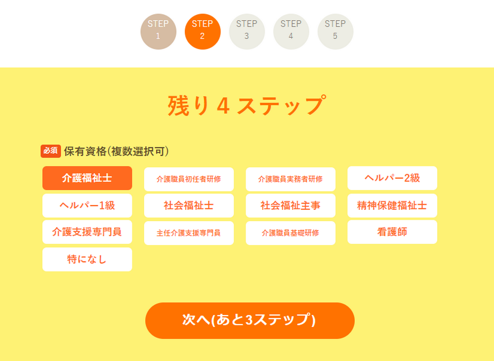 | ①転職時期と希望の雇用形態 | ②保有資格 | ③お名前と生年月日 | ④お住まいの入力 | ⑤電話番号と希望の面談方法 |
